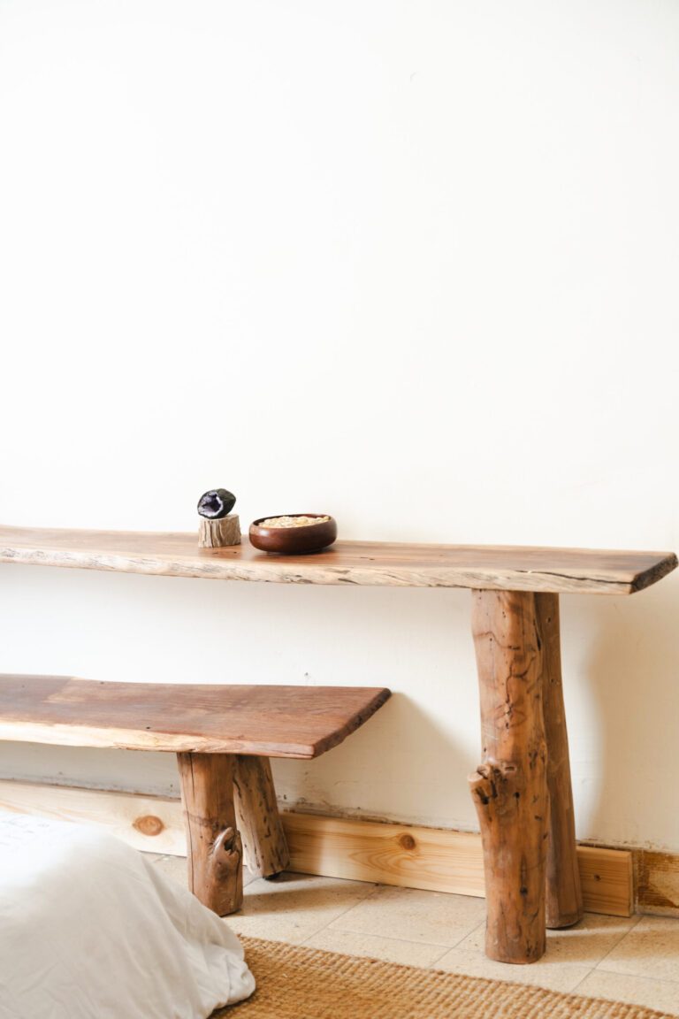 פלטות אקליפטוס אדום ורגליים מסנדות משוחחות יחד ויוצרות אווירה כפרית ונעימה